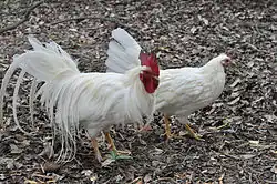 At Ise Jingu, roosters roam around and are believed to be the assistants of the sun goddess, Amaterasu. They wake her up every morning, according to folklore. Some experts believe that the rooster may be the bird depicted on the torii, a gate that marks the entrance to a shrine.[1] They are believed to call up the dawn with their sounds.[4]