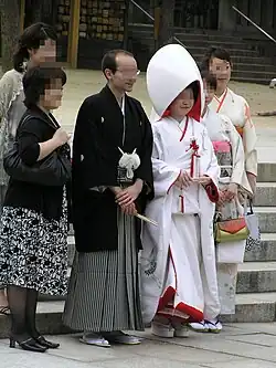 Shinto brides and grooms typically wear kimono. However, the groom can wear a Western-style business suit during the process.[9] The bride will wear a number of layers of kimono, the outermost layer being the most formal. A bride will either wear a colourful uchikake (打ち掛け) over-kimono, or a pure-white shiromuku (白無垢, lit. "white pure-innocence") over-kimono. The uchikake, a garment derived from the ostentatious over-kimono worn by samurai women before the Meiji Restoration, is typically a colourful over-kimono, made of a heavy brocade fabric that may feature a woven design or embroidery and couching in gold and silver thread. The shiromuku is also derived in part from the dress of the samurai classes, but is instead solid white in colour, featuring only woven designs, also in white. Though uchikake are often red, white and black - all auspicious colours in Shinto[4] - they may also feature other colours as part of their design.