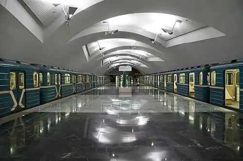 The main architect was Vadim Volovich of Metrogiprotans. In terms of structure, it is a shallow single-vault station with one island platform and two tracks.