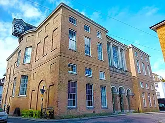 The building was commissioned to replace an earlier Sessions House which had been built in 1560 and demolished in 1768.[2] Although a team of Robert Adam and his younger brother James Adam were selected to design the building, James took charge of the commission and the Georgian style design is credited to him.[1] The building was completed in 1771.[1] The design involved a symmetrical main frontage with nine bays facing onto the Market Place with the end three bays on both sides slightly projected forwards; the central section of three bays featured a triple arched doorway on the ground floor and a triple sash window divided by two Ionic order columns on the first floor.[1] A projecting clock, designed, manufactured and installed by John Briant of Hertford, was erected on the south elevation of the building in 1824,[1][3][4] together with a set of bells (which were also manufactured by Briant).[5]