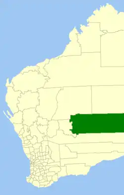 The Shire of Laverton is a local government area in the Goldfields-Esperance region of Western Australia, about 370 kilometres (230 mi) northeast of the city of Kalgoorlie and about 950 kilometres (590 mi) east-northeast of the state capital, Perth. The Shire covers an area of 179,798 square kilometres (69,420 sq mi), and its seat of government is the town of Laverton.