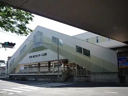 Shoko Center-iriguchi is a Hiroden station on Hiroden Miyajima Line, located south side of the JR Shin-Inokuchi Station in Inokuchi, Nishi-ku, Hiroshima.