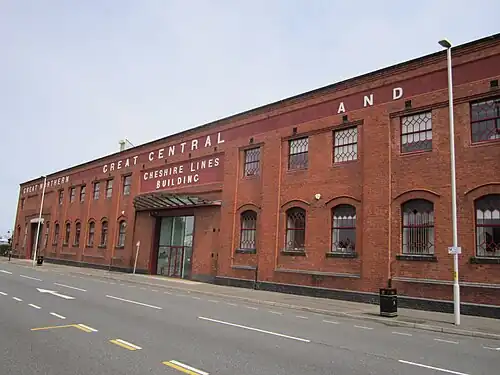 Shore Road Goods was a goods terminus in Birkenhead, England. The goods station was situated near to Morpeth Dock, on the Birkenhead Dock Branch railway line, and operated by the Cheshire Lines Committee.[1] The CLC was granted permission to run two locomotives on the dock lines from 13 March 1884.[2] The engine shed, which adjoined the goods station, was opened in 1888 and closed in 1961.[3] The main building of the goods station is still in existence, currently being for let and was in use until 2024 as an office for Wirral Metropolitan Borough Council's archives service.[4][5]