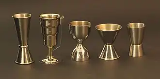 The term jigger in the sense of a small cup or measure of spirits or wine originates in the U.S. in the early 19th century. Many references from the 1800s describe the "jigger boss" providing jiggers of whiskey to Irish immigrant workers who were digging canals in the U.S. Northeast.[3][4]