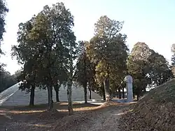 Today, the two stele are all that remain of the original complex. They now stand near the Shou Qiu monument with a small lake between them. The western stele is known as the "Qing Shou" Stele (Chinese: 庆寿碑; pinyin: Qìng Shòu Bēi; lit. 'Celebrate Longevity Stele'); the eastern stele as the "Wan Ren Chou" Stele (Chinese: 万人愁碑; pinyin: Wàn Rén Chóu Bēi; lit. 'Sorrow of Ten Thousand Stele'), supposedly because it took so many people to move it.[1] The former shrine to the Yellow Emperor on the site was built in 1012 CE, during the Xuanhe era of the Huizong Emperor of the Song dynasty.[2] The steles were also carved on site during the time, but were left lying on the ground unfinished, because the Song dynasty lost control of the area[2] to the invading Jurchens in the Jin–Song wars.