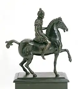The statuette shows a warrior wearing classical armour and riding bare-back, crying out in the heat of battle.[2][3] In his right hand, he holds the hilt of a sword (the blade is missing). The warrior's left hand may have originally held a spear or shield. The sculpture was cast between ca. 1510 and 1515.[1]