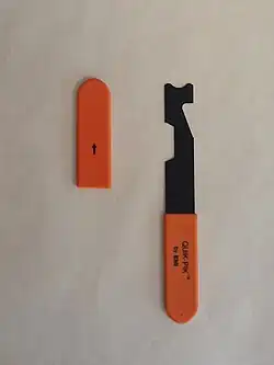A shove knife is a forcible entry tool used mainly by firefighters. Generally, they consist of a small, semi-rigid piece of 10 gauge steel with an indented end.[1] The device is inserted between a door and the door frame, above the spring latch on outwardly-swinging doors equipped with key-in-the-knob locks. The tool is pulled down and outward, releasing the locking mechanism.[2][3][4]