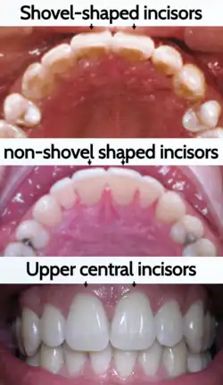 - ^ Portin P, Alvesalo L (July 1974). "The inheritance of shovel shape in maxillary central incisors". American Journal of Physical Anthropology. 41 (1): 59–62. doi:10.1002/ajpa.1330410108. PMID 4843087.