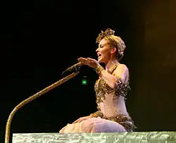 CBBC Newsround described the tour as the "perfect comeback" due to its "range of songs, excellent dancers, stage lighting and Kylie's love of performing".[8] Ludovic Hunter-Tilney from the Financial Times noted how "the outfits were as camp as the Rio carnival, the songs were irrepressibly bubbly and Kylie was as much the stage trouper as ever, beaming those huge white teeth at us and making no mention of recent ill-health", and felt her voice had improved since her previous tour.[9] A reviewer from the Manchester Evening News newspaper commented that "Showgirl remains a spectacle filled with genuine moments - not just because Kylie has been ill", attributing it to the "self deprecating and fun as well as emotional" nature of the concert.[10] For Priya Elan of NME magazine, the concert was "nothing less than a ‘Show!’", also commenting how the audience was "just happy to see their heroine healthy again", and "They are overjoyed to see her of course, but a long time ago Kylie Minogue realised that being a national treasure involved being entertaining for entertainment’s sake, and tonight, she is gloriously that".[11]