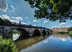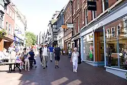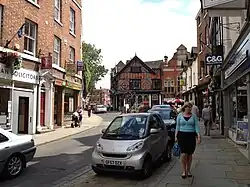 Shrewsbury thrived throughout the 16th and 17th centuries, a period when the town was at the height of its commercial importance. This success was largely due to the town's location, which allowed it to control the Welsh wool trade, a major industry at the time, with the rest of Britain and Europe, with the River Severn and Watling Street acting as trading routes.[85] This trade was dominated by the Shrewsbury Drapers Company for many years.[86] As a result, a number of grand edifices, including the Ireland's Mansion (built 1575) and Draper's Hall (1658), were constructed.