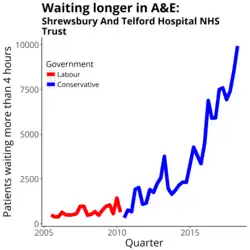 As with many Trusts operating over multiple sites it has long been under pressure to concentrate services on fewer sites.[4] In 2012, general and vascular surgery was successfully centralised at the Royal Shrewsbury Hospital. In 2014, consultant obstetrics and inpatients paediatrics was centralised at the Princess Royal Hospital. In November 2017 it was agreed that emergency services at Princess Royal Hospital should be downgraded and moved to Royal Shrewsbury Hospital.[5] A large-scale programme of hospital reconfiguration in Shropshire called FutureFit has been in progress since 2013.[6] In March 2018, the Department of Health and Social Care gave the go-ahead to more than £300 million worth of funding for the transformation of Shrewsbury and Telford Hospital NHS Trust. The plans went out to public consultation in May 2018.[7] In January 2019 the plans to convert the accident and emergency department in Telford into an urgent care centre and turn the hospital into a planned care site were approved by the clinical commissioning group.[8]