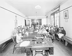 The formula for funding was on a per child basis.[15] To raise money, the number of children placed in the institution was increased. The school was built for 125 students; however, in the first year 146 children were placed in the institution, 62 students were in the single grade 1 class.[16] By 1938, 175 children were placed in the institution to try to make up for the financial hardship the institution faced. In 1957, there were 160 students, divided among four classrooms. The inspector in 1957 indicated, children required “much more individual attention”[17]