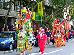 Shunfeng'er most often appears as a door god at Mazuist temples[5] or as a guardian beside Mazu at her altars[1] or on her yellow paper charms.[18] He is separately worshipped in some villages[12] or by mariners for assistance avoiding danger. During the 8-day, 250-kilometer (155 mi) annual pilgrimages from Dajia to Beigang, Mazu's idol is accompanied by 10-foot (3 m) figures of Shunfeng'er and Qianliyan played by masked men on stilts.[2]
