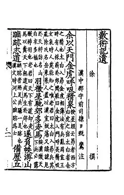 Shushu Jiyi (數術記遺; translated as Notes on Traditions of Arithmetic Methods, Memoir on the Methods of Numbering or Notes on Traditions of Arithmetic Method) is a Chinese mathematical treatise written by the Eastern Han dynasty mathematician Xu Yue.[1] The text received a subsequent commentary by Zhen Luan in the 6th century.