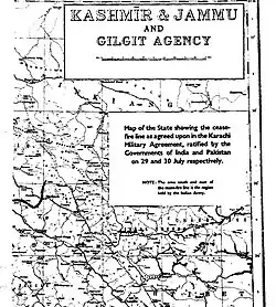 Map of the State of Jammu and Kashmir showing the Cease Fire Line as Agreed Upon in the Karachi Agreement, Ratified by the Governments of India and Pakistan on 29 and 30 July Respectively. (See Annex 26 to the third Interim Report of the United Nation Commission for India and Pakistan)[23][24]