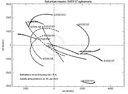 Offset plot showing the positions and ephemerides of 13 irregular satellites relative to Saturn in 2001. Siarnaq (S/2000 S 3) is located at the upper left from the center.