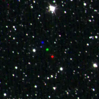 1. ^ Merger of three images, colored red, green, and blue respectively, to highlight Siarnaq as it moves relative to the background stars.