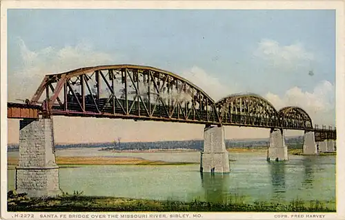 A vintage postcard depicting Santa Fe Bridge over the Missouri River
