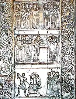 Scholars have sought Sicco's presence in the Gniezno Doors reliefs. Joachim Lelewel identified Sicco as the Prussian piercing the missionary with a spear in the martyrdom scene (panel 14), but did not associate him with the priest, whom he saw as the figure preparing to behead Adalbert with an axe.[21][22][23] Jadwiga Karwasińska suggested that the priest-leader is depicted in panel 12, holding a curved staff and standing at the forefront of Prussians listening to Adalbert's preaching.[24]