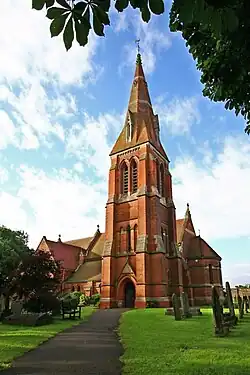 Gambier-Parry was the architect of All Saints' Church, Winthorpe (pictured), which was rebuilt in 1886 to 1888 to replace the old building.[11][12][13] The church was built on behalf of the Reverend Edward Handley, the rector of All Saints'.[14][15] Gambier-Parry was also the architect of the restoration of St Michael and All Angels parish church at Bulley in the Gloucestershire, a Grade I listed building.[16][17] Also referred to as St Michael & All Angels, Bulley (pictured), the church, aside from the nave walls, was rebuilt according to his design in 1886 and 1887. Changes included a new chancel, north vestry, timber-framed south porch, bell turret, and churchyard gates. Members of his family donated some of the new furnishings; Gambier-Parry supplied an oak lectern.[18][19] About 1887, he designed a pair of cottages at Highnam Green in Highnam.[20] In 1888 he built St Michael at Tidenham Chase, Gloucestershire, for Reverend Fielding Palmer.[21] The Grade II listed St Peter's parish church (now St John Chrysostom Greek Orthodox Church) in Bentham, Badgeworth, Gloucestershire, was built in 1888 to his design.[22] The churches of Bulley, Tidenham Chase, and Bentham are among those which demonstrate the influence of Woodyer.[8]