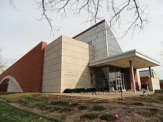 In May 2001, the IU School of Law moved to the newly built Lawrence Inlow Hall. Eskenazi Hall would undergo extensive renovations to become the new home for the Herron School of Art.[5] The renovations of the old law school building were designed by John Hess, a well-known Indianapolis architect.[6] The groundbreaking for the redesign and renovation of the building began on September 13, 2002.[7] The Allen Whitehill Clowes Charitable Foundation donated $2 million to the school of art to create a 250-seat auditorium in the new building.[8]