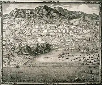 The siege of Barcelona of 1697 was successfully conducted during the Nine Years' War by France. Louis Joseph, Duke of Vendôme, commanding some 32,000 troops (reinforced with troops from the ended Italian front of the war),[2] forced the garrison, under Prince George of Hesse-Darmstadt, to capitulate on 10 August. Nevertheless, it had been a hard fought contest: according to John Lynn, French casualties totalled around 9,000, while the losses on the Spanish side were 12,000 killed, wounded, or lost,[3] although Antonio Espino López has set the figure for Spanish losses at 4,500 killed and 800 wounded, and the French casualties at 15,000, including 52 engineers.[4]