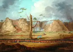 Combermere's army was made up of two divisions of infantry, one division of regular cavalry, a brigade of irregular horse, a large train of battering ordnance, several brigades of field artillery (horse and foot), along with a corps of engineers, sappers and other requisite troops.[5] The fortress at Bharatpur had been erected by the Jat rulers of Bharatpur and enhanced over the years. By the time Combermere arrived it was 8 miles (13 km) in circumference and surrounded by 35 clay and horse dung semi-circular bastions, which had been baked rock-hard by the sun. The fortress was considered impervious to artillery while its defences were enhanced by a 150-foot (46 m) wide and 59-foot (18 m) deep dry moat, which could be filled by diverting water from a nearby lake.[6] Combermere arrived in Agra on 1 December 1825 and reached Bharatpore on the 10th. On arrival, troops were despatched to capture the reservoir to the north west of the fort to prevent the enemy flooding the area as they had done during the 1805 siege. By the middle of December the fort was surrounded by British forces with skirmishes occurring on a daily basis. The siege continued until the night of 18 January when two breaches were made and mines exploded so that within two hours the fort had been stormed and taken.[7]
