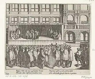 The first artworks to depict the siege were two engravings by Frans Hogenberg which were published shortly thereafter. One focuses on the siege, and the other portrays the sack of the city, chiefly the escape of the townsfolk across the bridge over the Meuse and the Spanish violence. Hogenberg, a Protestant based in Cologne, depicted many sacks by the Army of Flanders, but none by the Dutch rebels.[172] Hogenberg's visual reports were directed to politically interested contemporaries and appealed to the feeling of the beholder, thereby fostering support for the Dutch Revolt.[173]