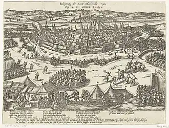 The Siege of Maastricht was undertaken in a moment in which the Royal authority had almost collapsed in the Spanish Netherlands. A wave of Protestant, popular violence known as Beeldenstorm had erupted in 1566, leading Philip II to dispatch an army under the Duke of Alba to the region in 1567.[3] Alba prosecuted the Protestants and those whose loyalty to the king was under suspicion, implemented a new episcopal reform and defeated an invasion by William of Orange from Germany. However, his fiscal policies, intended to finance the Spanish Army of Flanders, were highly unpopular and led to a new rebellion in the spring of 1572.[4] This quickly spread across Zeeland, Holland and Gelderland, where the Geuzen and Orange's followers took control of many towns and cities.[5] Alba failed to suppress the revolt and was replaced as governor by Luis de Requesens in 1573. The latter coupled military pressure with political negotiations in order to pacify the Low Countries, yet his efforts failed as a consequence of the Spanish bankruptcy of 1575. His sudden death in March 1576 created a power vacuum. The Council of State, which was to rule the country until Philip II designated a new governor, was divided between opposite factions led by the Spaniard Gerónimo de Roda and the Netherlandish nobleman Philippe III de Croÿ, Duke of Aarschot.[6] Over the summer, the inability of the Spanish military command to pay its soldiers resulted in a series of mutinies which prompted the provinces loyal to Philip II to join forces with those rebellious in the Pacification of Ghent with the common goal of expelling the foreign troops and restore the peace.[7]