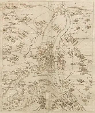 As the States-General were assembling forces to march in relief of Maastricht, the Spanish command also decided to build a circumvallation line on both sides of the Meuse to fully isolate the city. The soldiers were exhausted and many pioneers had left the camp, so Farnese dispatched cavalry troops to gather peasants from the villages nearby and hired 3,000 coal miners from Liège.[109][110] Meteren attributed the willingness of the Liegois to collaborate with the Spanish to the fact that they were all Catholics, to the maneuvers of Gerard van Groesbeeck, Prince-bishop of Liège – who shared the sovereignty of Maastricht with Philip II and was resentful of the city's independence – and to the grudge of the people from Liège towards the Netherlanders.[111] The arrival of the new contingents of pioneers allowed a cordon of earthen forts linked by ramparts to be quickly put in defense. Eleven redoubts were built on the Brabant side, and five in front of Wyck.[107][112]