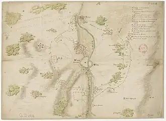 The first assault was delayed until July 21, and focused on the what was considered the weakest portion of the city defences, the Bossche Fronten near the Bosch Gate (see Map, I). During the attacks in late July and August, the Dutch forces suffered a thousand casualties, including Karel Florentine, lieutenant general of the infantry, who died of wounds.[14] Meanwhile, the Marquis of Louvignies, commander of the Army of Flanders, focussed his attack on the southern defenses, near the village of Sint Pieter (see map, K).