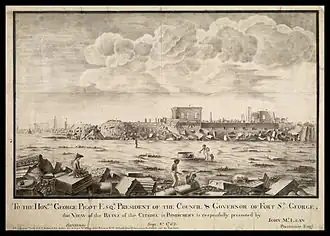 The siege of Pondicherry (1760–1761) was a conflict in the Third Carnatic War, as part of the global Seven Years' War. Lasting from 4 September 1760 to 15 January 1761, British land and naval forces besieged and eventually compelled the French garrison defending the French colonial outpost of Pondicherry to surrender. The city was running low on supplies and ammunitions when French commander Lally surrendered. It was the third British victory in the region that was under the command of Robert Clive.[1]