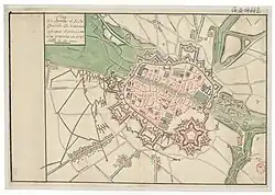 The first French forces closed on the city on 25 April. Van Dorth immediately had Tournai's suburbs set on fire and ordered a sortie on Orcq, which was easily repelled by the French cannon. After a series of diversionary moves, Saxe laid siege to Tournai on 28 April with his main force of 72,000 soldiers.[3] He moved his men into the siege lines, crossing to the left bank of the Scheldt in order to surround the Vauban-designed citadel.[4] The defences had been poorly maintained and sectors were in disrepair; Saxe planned to make these sections his primary effort, directing his artillery against the same sector of walls breached by the Duke of Marlborough in the siege of 1709. French engineers constructed pontoon bridges at Calonne and Constantin to enable communication and movement between Saxe's forces on both banks of the river.[5] On the evening of 30 April to 1 May, a trench was opened opposite the Porte des Sept-Fontaines, on the left bank of the Scheldt. The French cannon were quickly unleashed on the city's fortifications.[6]