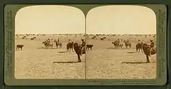 Prior to the Gold Rush, cattle were primarily valued for their hides and tallow. A mature steer rarely fetched more than $4.00 a head (or about $151 today). The miners and merchants who came to California as a result of the Gold Rush fed an explosion in the state's population and a concurrent demand for beef. The price of cattle rose up to $75 a head (around $1,541 today).[5] Ranchers could turn a profit driving cattle from as far as Oklahoma, Texas, New Mexico and Arizona to California even though the Chiricahua Apaches took many cattle.[6] The ranchers would drive the cattle up California's Central Valley. Once they arrived in the San Joaquin Valley and Sacramento Valley, they would rent pasture and fatten the cattle up before selling them for a handsome profit.[7]