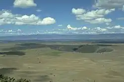 Faults in the area tend to be younger than the upper volcanics, excluding those associated with calderas,[51] but do occur in distinct periods.[40] The large faults along the eastern slope[51] have caused the slope to be made up of large escarpments that face into the interior basins.[58] These faults are commonly covered by alluvium and basalt, making them difficult to discern, but can be found in certain fault blocks.[51]