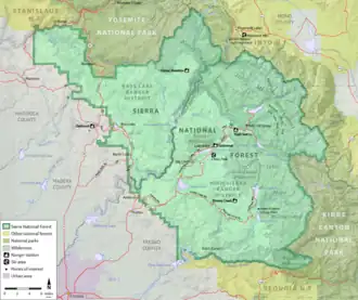 Sierra National Forest is a U.S. national forest located on the western slope of the central Sierra Nevada in California, bounded on the northwest by Yosemite National Park and on the south by Kings Canyon National Park. The forest is known for its mountain scenery and beautiful lakes. Forest headquarters are located in Clovis, California. There are local ranger district offices in North Fork and Prather.[1]