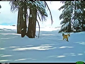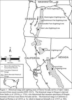 Sierra Nevada red foxes are one of three fox subspecies in the montane clade of North America, occurring in the Cascade Mountains south of the Columbia River and California's Sierra Nevada range.[4][5] Joseph Grinnell identified separated montane fox populations in the Oregon Cascades, Mount Shasta, Lassen Peak, and Sierra Nevada in 1937.[6] Study then lapsed for approximately 60 to 75 years, depending on location. Rediscovery of the Lassen population began in 1993[2] followed by detection of a Sierra Nevada population at Sonora Pass in 2010[7][8][9] and rediscovery of the Oregon Cascades population began in 2011.[10] The Lassen and Sonora Pass populations are isolated from each other and it is unknown if a population remains at Mount Shasta.[3]