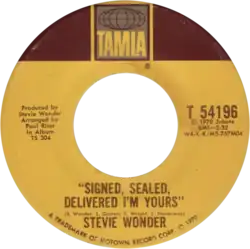 "Signed, Sealed, Delivered (I'm Yours)" is a soul song, by American musician Stevie Wonder, released in June 1970 as a single on Motown's Tamla label. It spent six weeks at number one on the U.S. R&B chart and peaked at number three on the U.S. Pop chart.[2] In the same year, the song was also released on the album Signed, Sealed & Delivered.