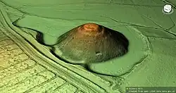 The base of the hill is circular and 167 metres (548 ft) in diameter. The summit is flat-topped and 30 metres (98 ft) in diameter. A smaller mound was constructed first, and in a later phase much enlarged. The initial structures at the base of the hill were perfectly circular: surveying reveals that the centre of the flat top and the centre of the cone that describes the hill lie within a metre of one another.[7] There are indications that the top originally had a rounded profile, but this was flattened in the medieval period to provide a base for a building, perhaps with a defensive purpose.[9]