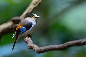 The silver-breasted broadbill (Serilophus lunatus) is a species of bird in the broadbill family, Eurylaimidae that is found in parts of Southeast Asia. There are seven currently recognised subspecies; the other species in the genus Serilophus, the grey-lored broadbill, was also previously treated as being a subspecies of this species.