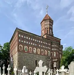 The church is triconch in form, with walls up to 1.5 metres (4 feet 11 inches) thick. Adhering to the Moldavian style of church architecture, its dimensions are 22.65 by 10.60 metres (74.3 by 34.8 feet). A large stone cross was placed on the right side of the church in 1906. This dates to 1677, to the reign of Antonie Ruset. It is ornamented and inscribed in Romanian Cyrillic.[2]