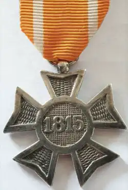 The Silver Memorial Cross 1813–1815, (Dutch: Zilveren Herdenkingskruis 1813–1815) was a campaign medal instituted by King William III of the Netherlands on 10 May 1865. It was awarded to surviving veterans of the Dutch armed forces who, between 1813 and 1815, helped to restore Dutch independence. This included participating in the 1814 campaign to end the occupation of the Netherlands by Napoleon's French forces, and in the final Hundred Days campaign of 1815, including the battles of Quatre Bras and Waterloo.[1]