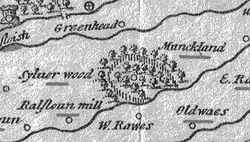 Timothy Pont's map of circa 1654 (See illustration) shows 'Sylverwood' with wooded policies and a pale encircling it on three sides, the Templeton Burn forming the boundary to the West. The land is referred to in 1691 as being the three pound land of old extent. In circa 1640 Hew Montgomerie of Silverwood was one of the rentallers of Grougar and the valuation was £76 9s 4d.[1]