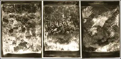 Critics suggest that Malagrino's early black-and-white photographic work served as a springboard for poetic expression in the realm of memory and dreams.[18][19][21][22] She blended smaller units to produce large works centered on the body and psyche, nature and the primordial, often obliterating the original imagery to create what critic David McCracken called, a "neat, new balance of barely suggested figures and images in a depthless field of murky abstraction."[18][23] Writer Judith Russi Kirshner described this work, in Malagrino's "Earth Calls" exhibition (1993), as a "rich array of textures, layered imagery and […] an uncertain imaginative terrain" that built "aesthetic connections to the forces and energies of survival."[22][13][15] Her 1992 "Habitat" series (see above) used these strategies to reflect on issues of power and dominance relating to the land and individuals through images that suggested aerial mappings and spiritual figures of tribal cultures.[23][24][25]