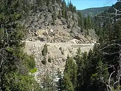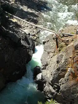 The bottom portions of the falls can be seen quite easily by looking upstream into the canyon from Highway 3.[3] The uppermost portions are hidden from that point since the falls bend about 45 degrees shortly below the first drop, and as a result can only be viewed from the edge of the canyon on the north side of the river.