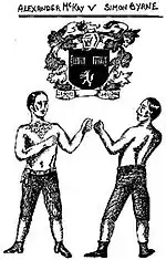 The fight against Alexander McKay was Byrne's first brush with notoriety. On 2 June 1830, Byrne, billed as "Champion of Ireland", fought McKay, the "Champion of Scotland", for the right to challenge Jem Ward, the heavyweight champion of England.[2] The match had been organized at Tom Spring's "Castle Tavern", in Holborn. The former champion boxer Tom Spring, as treasurer of the "Fair Play Club" – the organization which oversaw boxing – was immensely influential in the boxing world. Along with two other well-known boxers, Gentleman Jackson and Tom Cribb (who also acted as Byrne's manager), he was Byrne's sponsor for the match. Cribb was considered to be one of the greatest fighters of the era; more than 20,000 people attended one of his fights.[2]