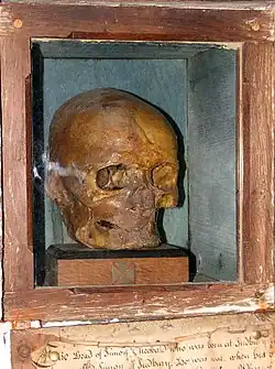 Sudbury, who was saying Mass in St John's Chapel, was dragged to Tower Hill together with Sir Robert Hales, the Lord High Treasurer. According to an account written by John Stow two centuries later, Sudbury was beheaded by eight frenzied sword blows to his neck, one of which also took off the fingers from one hand. His body lay in the open all day, but his severed head had his clerical hood nailed onto it and was fixed to a pole, then placed on London Bridge. His body was afterwards taken to Canterbury Cathedral, though his head was taken down after six days by William Walworth, the Lord Mayor of London,[6] and was taken to Sudbury, where it is still kept at St Gregory's Church, which Sudbury had partly rebuilt.[2] With his brother, John of Chertsey, he also founded a college in Sudbury; he also did some building at Canterbury. His father was Nigel Theobald, sometimes called Simon Theobald or Tybald, who is also buried at St Gregory's, with his wife Sara.[7]
