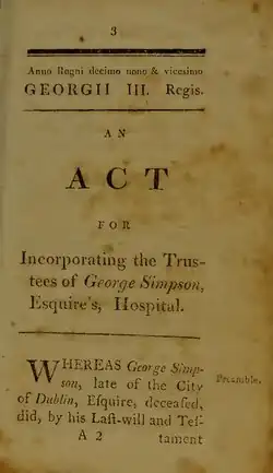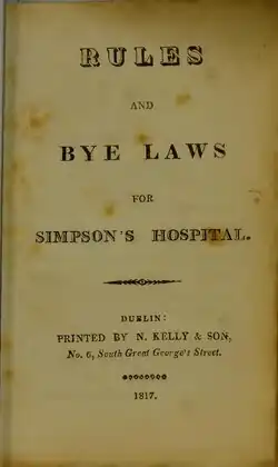The hospital was founded under the terms of the will of George Simpson, a merchant who lived at 24 Jervis Street, Dublin around the time of his death in 1779.[1] He suffered from blindness and gout. He devised his estate for the purpose of founding an asylum for blind and gouty men in reduced circumstances and inmates of the hospital were to be lodged, fed and clothed.[2][3] He also provided for the care of his wife Catherine Simpson in her lifetime.[4]