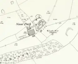 From the late 18th century the estate was rented out to a number of merchants and farmers. By 1796 it had settled on the modern spelling of Sinai Park, apparently coined by William Burton in 1622 as an allusion to the Biblical wilderness which he alleged the estate resembled.[3] In the Georgian era a plunge pool, fed by the chalybeate spring, was installed and said to have healing properties; on later maps it is labelled as the "Lord's Well".[5] The house's porch was refurbished in the 19th century with a new facing, set in from the timbers, and three casement windows installed.[2] The last Paget owner was the eccentric Henry Paget, 5th Marquess of Anglesey, the estate was sold to pay off his debts.[5][4]