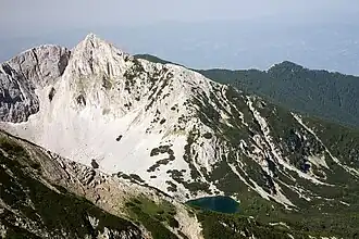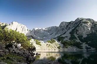 The Sinanishko Lake (Bulgarian: Синанишко езеро) is a glacial lake in the Pirin mountain range, southwestern Bulgaria, situated about 700 m to the north–northeast of the summit of Sinanitsa (2,516 m) in the small Sinanitsa cirque at an altitude of 2,181 m.[1][2][3] Reaching depth of 11.5 m, it is among the ten deepest lakes in the mountain range. It has an elongated shape with maximum length of 175 m and a width of 80 m. The surface area is 10,100 m2.[4] Its waters pour out under the ground and they appear on the surface 120 m away from the lake and form the beginning of the river Sinanishka, a left tributary of the Vlahina reka of the Struma river basin.[1][4] Close to its northern shores is located the Sinanitsa refuge.